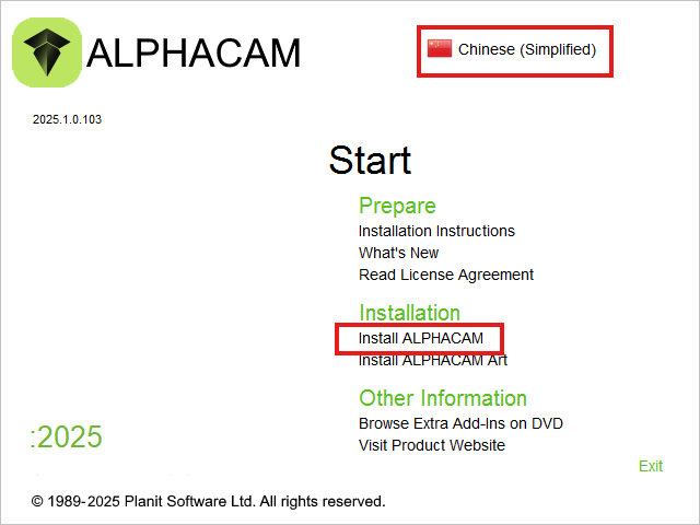 选择Chinese(Simplified)简体中文版本,然后选择下方的Install ALPHACAM进行安装: