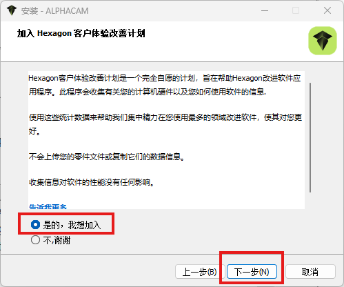 3、是否加入Hexagon客户体验改善计划可自行选择,然后点下一步: